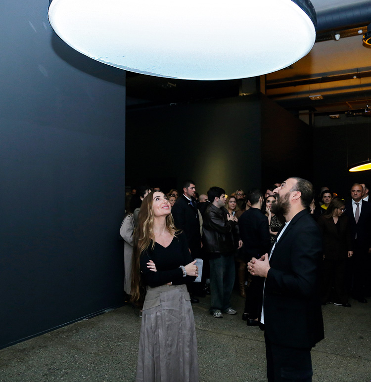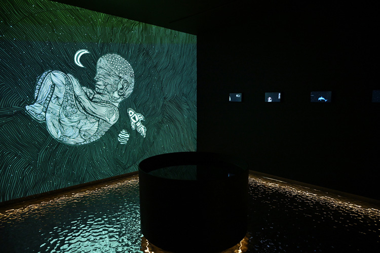 Волнообразные архитектурные формы Центра Гейдара Алиева идеально подошли для экспозиции. Вода предстает стихией, без которой невозможно зарождение и поддержание жизни, – и одновременно мифологическим образом, связанным с потоком времени и цикличностью истории. Все эти сюжеты отражены в инсталляции Лейлы «Священный Грааль жизни». Посетитель попадает в темную комнату, где на экране под звездным небом проецируются образы материнства. В центре пространства стоит чаша, наполненная водой: меняющиеся на экране сюжеты отражаются в ее зеркальной поверхности. У зрителя возникает ощущение, что он буквально ходит по воде: древний архетип, символизирующий победу духа над плотью.