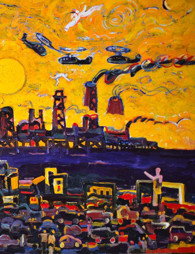 Так же как у каждого сна есть только один выход – в пробуждение, у каждого творения художника есть «потайная дверь» в узнаваемость, в то, что называют почерком Мастера. Это – небо. Оно присутствует на всех работах Мусеиба Амирова. К нему обращены лица, воздеты руки персонажей, стрелками невидимого компаса указывают в него макушки кипарисов, крыши домов, дымящие трубы города. Амировское небо – живой организм, движущийся, звучащий, манящий, наблюдающий. Амировское небо – вот оно, состояние № 1. Что же будет состоянием № 2? Наверное, небо, смотрящее на нас.