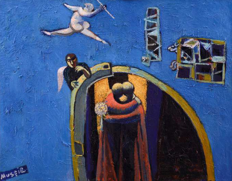 «Два состояния» – интересно, какие? «Которые «до» и «после», – шутливо ответил художник. На самом деле графические и живописные работы, вошедшие в экспозицию, отображают не два и даже не двадцать состояний, а бесконечность, имя которой – мгновение. Каждая работа – это пойманное состояние, которое уже никогда не повторится. Как схваченный в последнюю секунду предрассветный сон, который, просыпаясь, помнишь в мельчайших деталях и поражаешься, насколько абсурдно и в то же время реально было увиденное. Подобно фантасмагорическим снам затягивают и картины Мусеиба Амирова – в них можно блуждать часами, разглядывая каждую подробность, удивляясь совместимости несовмещаемого. Иногда создается ощущение, что в холсте использован прием наложения кадров: если можно было бы раскрыть его как гармошку, то получился бы фильм с последовательным сюжетом, но художник уложил все кадры-состояния один на другой, смешав прошлое, настоящее и будущее в один лабиринт, выйти из которого можно, лишь придумав собственную историю.