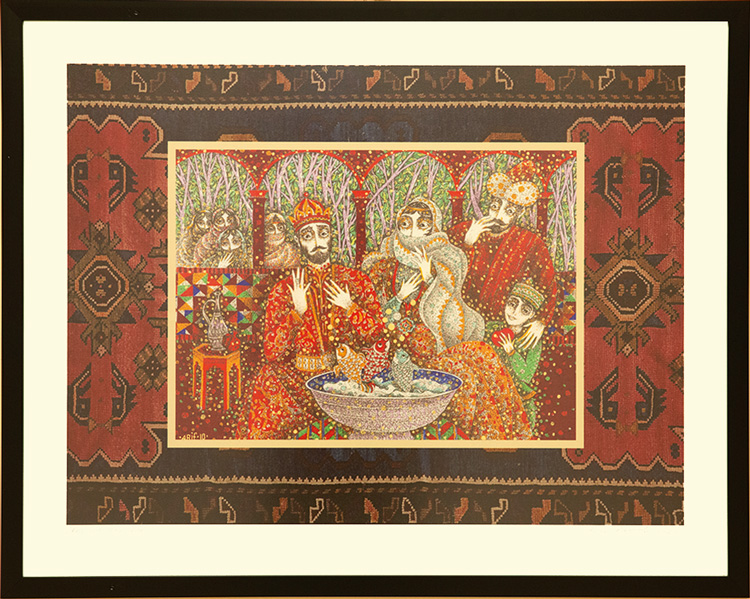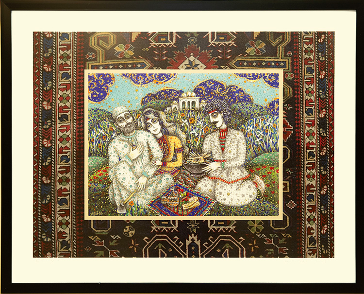 В нынешнем году художник отмечает 80-летие, и в Музее ковра положен старт череде будущих выставок. Неслучайно именно здесь: энергия работ Гусейнова, красочный мир его графики и живописи органично рифмуются с буйством орнаментов и скрытых символов тебризских, карабахских, шемахинских, гянджинских, ширванских ковроткачей. Художник буквально переводит язык ковра на бумагу: избранная им техника пуантилизма напоминает множество мелких узелков, из которых соткана яркая шерстяная поверхность. Сюжет сказок прихотливо наложен на строгую ковровую геометрию. 54 принта любовно обрамлены фрагментами знаменитых безворсовых и ворсовых азербайджанских ковров.