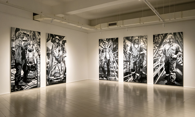 Историю азербайджанской нефтяной отрасли Сабина начала исследовать еще в 2018 году и тогда же презентовала монументальную работу Oil Еpic. Нынешняя выставка продолжает эту тему и состоит из нескольких частей. На гигантских живописных черно-белых полотнах молодые нефтяники предстают в образе древнегреческих атлантов – зритель смотрит на этих героев во всех смыслах снизу вверх. Видео на экранах, смонтированных на нефтяных баках, преподносят нефть как природный элемент – например, в документальных кадрах платформы в бушующем море. «Глядя на это жуткое зрелище, понимаешь, что испытывают работники нефтяной отрасли, которые в течение нескольких недель несут вахту на платформе», – комментирует Шихлинская. Еще на одном видео пляшут огненные языки пламени, а нефтяная пленка растекается причудливыми разводами на поверхности моря.