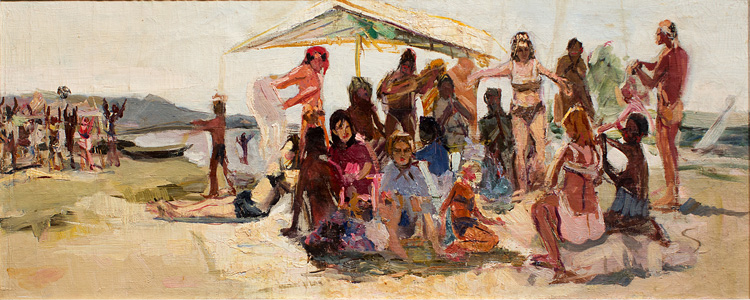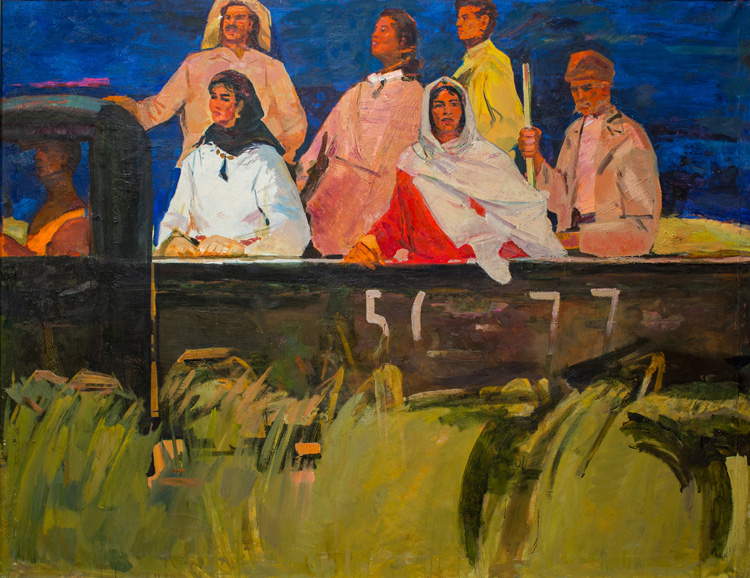 Для своих лет Ашраф Мурад (1925–1979) получил вполне традиционное образование как художник: в 1946 году окончил Азербайджанский государственный художественный техникум им. Азима Азимзаде в Баку, а в 1954-м – Ленинградский государственный институт живописи, скульптуры и архитектуры им. И. Е. Репина. Его карьера продлилась недолго по живописным меркам – без малого 25 лет, и началась со вполне ожидаемого соцреализма. Дипломный проект 1954 года – жанровая картина на исторический сюжет, изображающая знакомство Лермонтова с родоначальником азербайджанского литературного реализма Мирзой Фатали Ахундовым. За ней последовали сходные по стилю «А. Грибоедов и А. Бакиханов» (1958–1960) и «Стремление к свободе» (1960), «революционное» по духу, но более импрессионистское по исполнению.