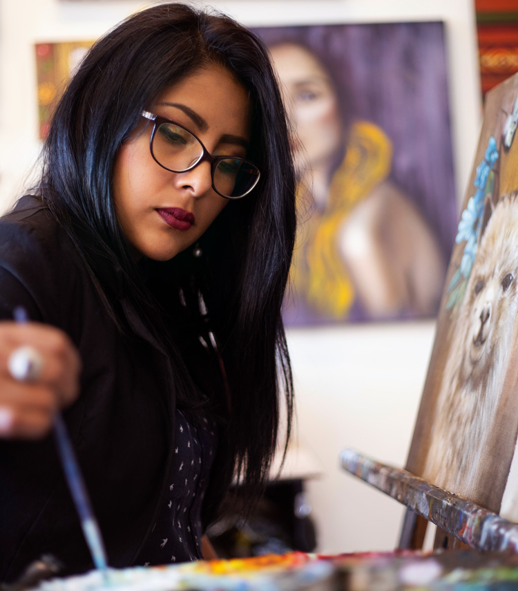 Как все перуанские дети, Каролина Марисоль Алехо Рамос – так звучит полное имя художницы – с детства была знакома с альпаками: они встречались ей и рядом с домом, и во время семейных поездок в горы. Когда повзрослевшая Соль окончила Национальную школу изобразительных искусств в родном городе Арекипа, на местной арт-сцене главенствовала традиционная живопись – пейзажи и жанровые сцены. Но вчерашней студентке хотелось найти свой художественный язык, и она начала экспериментировать с цветом и декоративными приемами.