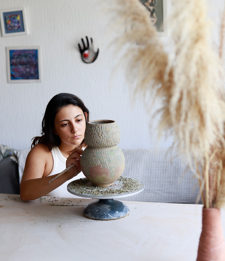 Умай Абдуллаевой 29 лет, выглядит она еще моложе, а вот рассуждает явно взрослее. Говорит быстро, улыбается щедро, смеется звонко, как колокольчик. Именно с керамических колокольчиков начался в 2018 году ее бренд Zingirov Ceramic.