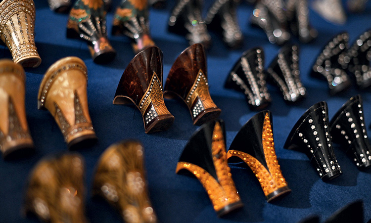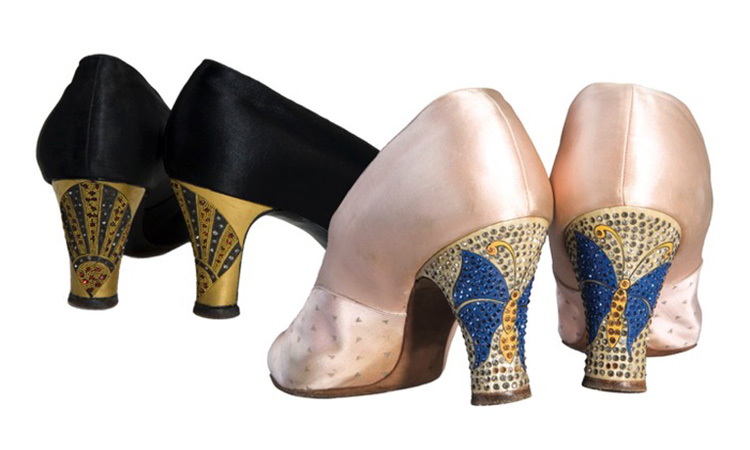 Танцевальная лихорадка эпохи джаза способствовала бурному развитию обувной индустрии: подол дамских платьев заметно укоротился, и туфли оказались в зоне повышенного внимания. На выставке представлено огромное разнообразие фасонов, расцветок, текстур, форм носков и каблуков. «А эту пару французская фирма Hellstern & Sons создала в единственном экземпляре для аргентинской клиентки – жены некоего богатого авиатора», – комментирует Назим Мустафаев, указывая на туфельку «в египетском стиле» с причудливо завернутым вверх носком. Интерес к Древнему Египту вспыхнул в 1922 году с открытием гробницы Тутанхамона. Ар-деко вообще охотно вбирал в себя сюжеты, заимствовал символы самых разных культур: художников и дизайнеров вдохновляли Китай, Индия, Япония, традиции коренных народов Америки.