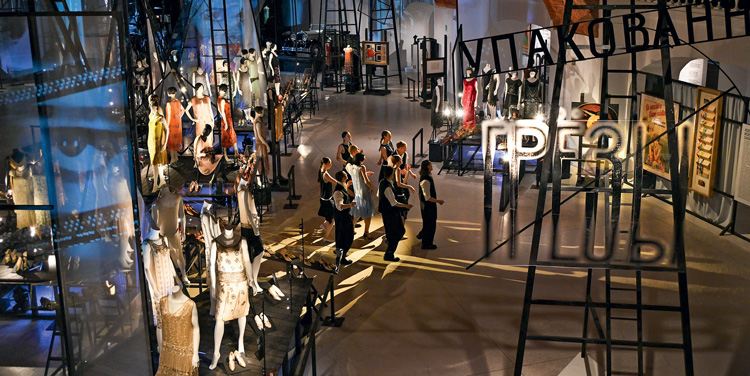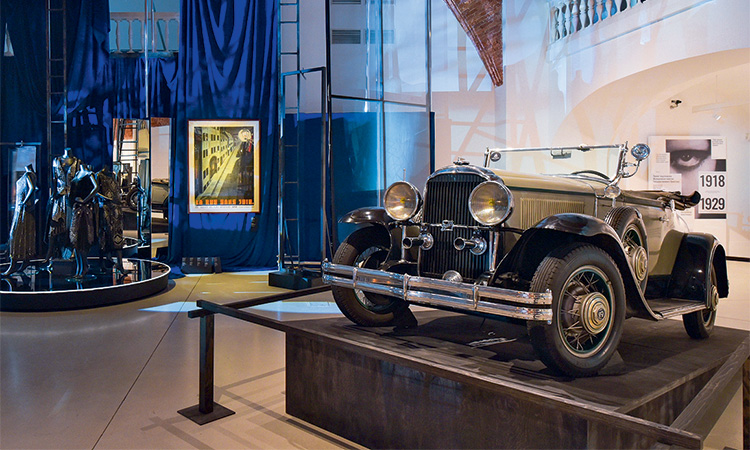 Зритель погружается в атмосферу Интербеллума – недолгого периода между двумя мировыми войнами, наполненного призрачными грезами, самозабвенными танцами и подспудно ощущаемым драматизмом. Сценографы проекта театральные художники Эмиль Капелюш и Юрий Сучков превратили выставочное пространство в старый кинопавильон, расчерченный графикой лестниц, стремящихся к потолку. В глубине зала припаркован Buick 44-й серии 1929 года из Музея техники Вадима Задорожного. Тут и там – киноафиши фильмов 1920-х – начала 1930-х годов: кино помогало забыть о тяготах повседневности и справиться с мрачными предчувствиями. А предприимчивая Коко Шанель, подписывая контракт с голливудской киностудией, заметила: «Сегодня именно через кино можно продвигать моду».