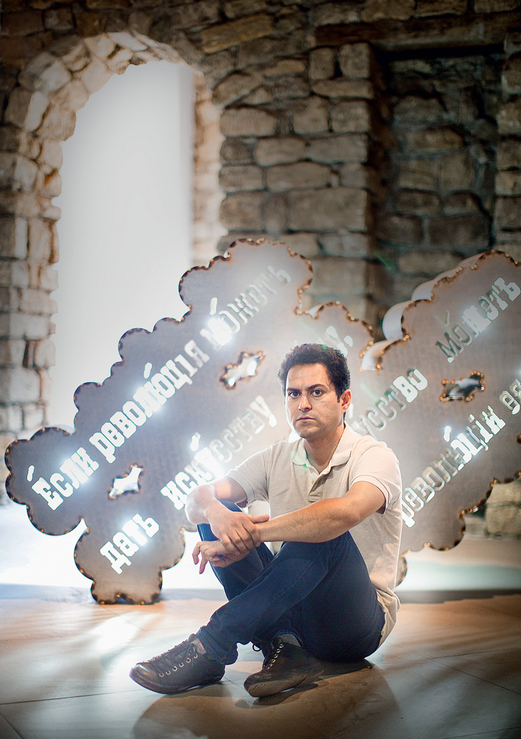 На этот раз в Баку приехала персональная выставка Махмуда Бахши TalkCloud, наиболее полно представляющая художника. Он работает в разных жанрах, создает рисунки, скульптуры, видеоработы в стиле визуальной эстетики. С помощью приема повторной контекстуализации официальных символов Исламской Республики Иран Бахши переосмысляет новейшую историю своей страны, размышляет о социальной роли искусства, пытается проследить его связь с религией и государством. Символика, с которой работает Бахши, более близка людям из исламского мира, но интерпретирует ее он в традициях современного западного языка – например, в духе художников стиля arte povera часто использует предметы быта, найденные в самых неожиданных местах, а также промышленные материалы. Так, на выставке можно увидеть светящиеся изнутри скульптуры, напоминающие традиционные произведения персидской каллиграфии, но вместо поэтических четверостиший на них начертаны широко известные высказывания Ленина, Хомейни, Луначарского, Энди Уорхола.