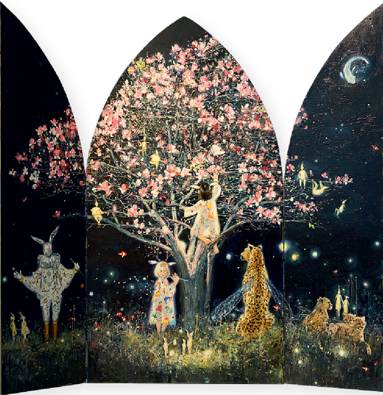 Итог теме мифологического древа жизни подводит Фидан Ким, азербайджанка, живущая в Калифорнии. В своей работе «Фантасмагория» она выстроила маленький алтарь, где цветущее растение – центр идеальной вселенной, собирающий под своей кроной-куполом людей, зверей и крылатых эльфов, дарящий всем надежду. На возможную надежду намекает и российский художник Николай Макаров: на его растянувшемся во всю стену полотне («Без названия») сквозь тучи пробивается призрачный свет.