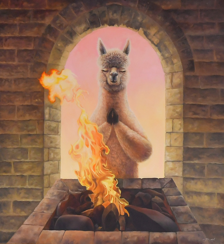 Соль Алехо неслучайно населяет свои картины альпаками. Эти симпатичные, кроткие животные из семейства верблюдовых издревле обитают на горных склонах Анд. Альпаки, одомашненные много тысяч лет назад местными племенами индейцев, стали частью перуанской культуры, а их мягкая шерсть – символом тепла и уюта.
