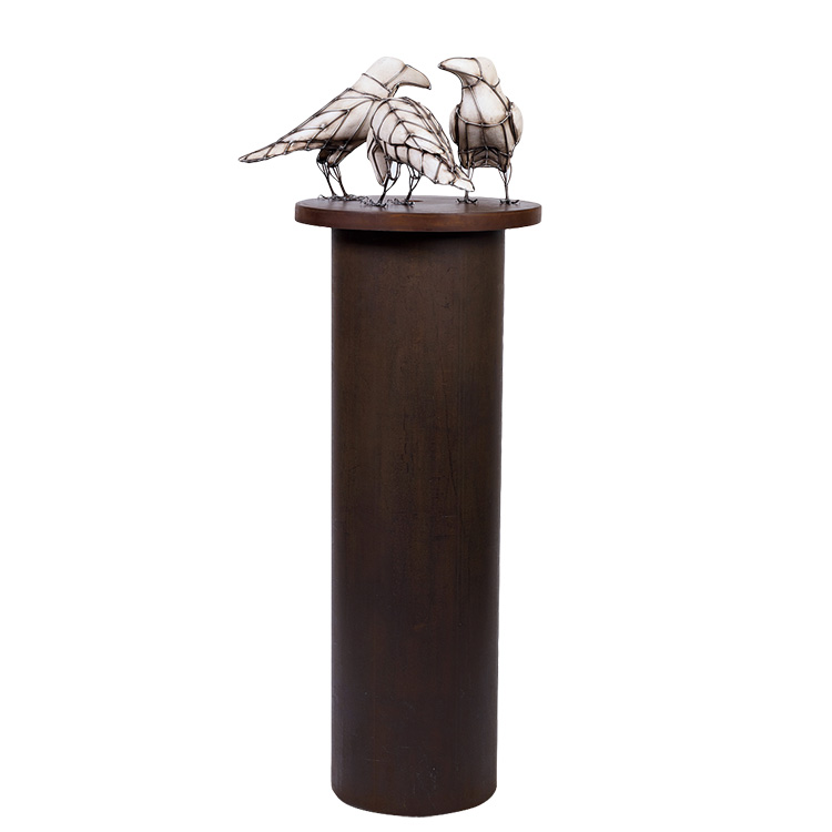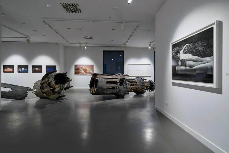 Но в основе своей пейзаж – это в первую очередь конструирование его из элементов и форм, узнаваемых как миметическое подобие ландшафта. Юньцзинь Цзюн сопоставляет на одной стене собственные монохромные рисунки на шелке – абстрактные пятна, в чьей совокупности узнается контур морского берега или покатость гор. Каллиопи Лемос конструирует биоморфные формы из минималистических металлических пластин. Серия фотографий Франческо Джодиче, сделанных в американских прериях и каньонах, кажется мимесисом наоборот. Мы настолько привыкли к подобным видам Америки, знакомым из кино и рекламы, что складывается ощущение, будто эти пейзажи были сами произведены по лекалам, широко представленным в массмедиа.