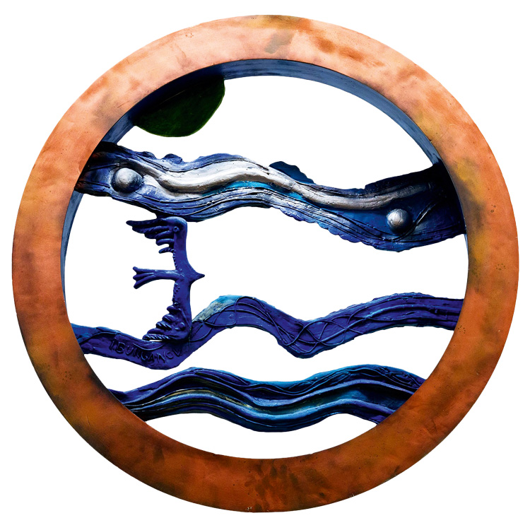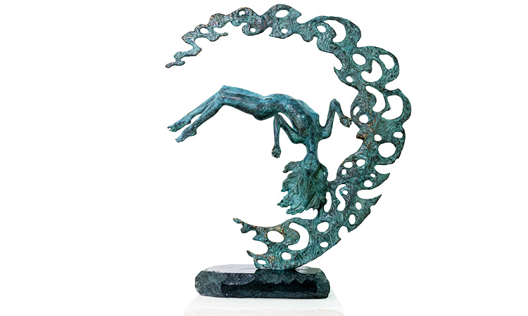 Большинство показанных на выставке арт-объектов отсылает наше воображение к тем или иным узнаваемым мотивам. Так, в работе Анатолия Смоленкова «У моря» мраморная фигура обнаженной девушки, выжимающей мокрые волосы, напоминает античный рельеф с изображением Афродиты, рождающейся из моря. Ощущение древности, архаичности сочетается с впечатлением от прекрасного женского тела и водной стихии. Море здесь не только в струящихся и волнами сбегающих длинных волосах «богини любви», но и в ее устремленном куда-то за горизонт взгляде – море у нее в глазах.
