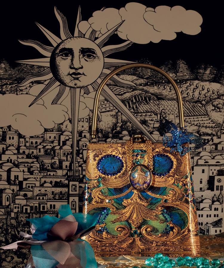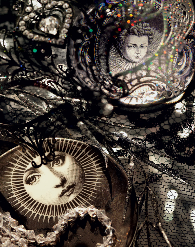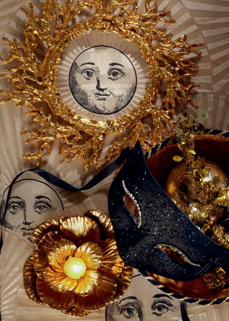 Напольный светильник, Fornasetti; сумка, пресс-папье, колье, Natasha Farina; брошь, Б. Балтабаев; бусы, Merry Crystal; маска-магнит, La fucina dei miracoli