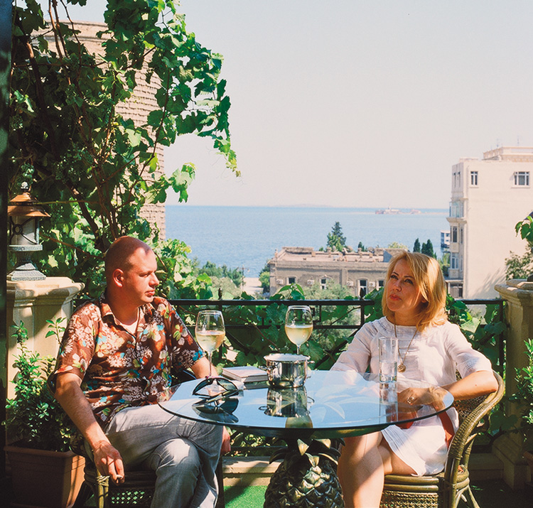 Закончив съемку, идем гулять по городу. Заходим в магазин «Али и Нино». У кассы обязательная выкладка романа на английском и русском. Нигяр дарит мне свое на тот момент новое детище – «Баку и окрестности», альманах современных азербайджанских писателей. Говорит, что хочет учредить первую в Азербайджане литпремию и тем самым привлечь внимание общества к писателям: «Ведь надо дать шанс новым авторам написать новую «Али и Нино». На улице Независимости (бывшая Николаевская) пытаемся найти школы, в которых учились главные герои. Фотографируемся в Губернаторском садике, где они встречались. Его, как и весь город, реставрируют. У входа стеклянная пирамида – «как в Лувре», наши проводники улыбаются: новый вход в метро строят. В самое пекло прячемся в Крепости, плутаем по улочкам в поисках подходящей крыши: Али любил лежать на крыше своего дома и смотреть на город, спускающийся амфитеатром к морю. Ближе к вечеру отправляемся в книжное кафе «Али и Нино», четвертую точку маленького семейного холдинга. Там нас ждет Мирза Гусейнзаде, коренной бакинец, пожилой азербайджанец интеллигентного вида – наверное, таким станет Орхан Памук в старости. Пока «утомленные солнцем» раскладывают фотоаппаратуру, расспрашиваю Мирзу о его отношениях с романом. Мирза говорит на блестящем русском («Я филолог, да и жена у меня русская, Светлана, – смешанный брак, как в романе»).