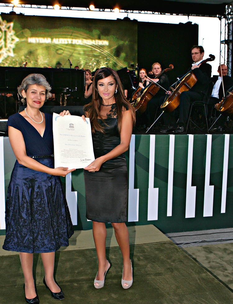 Генеральный директор ЮНЕСКО Ирина Бокова вручила Мехрибан Aлиeвой золотую «Медаль Моцарта» в знак признания ее огромной работы по сохранению и популяризации культурного наследия человечества, усилий по развитию межкультурного диалога, вклада в упрочение культурного многообразия и преданности идеалам и целям ЮНЕСКО. Награда была вручена во время Международного музыкального фестиваля в Габале. Он впервые прошел в прошлом году и стал еще одним шагом Фонда Гeйдaра Aлиeва по пропаганде азербайджанской и мировой музыки.