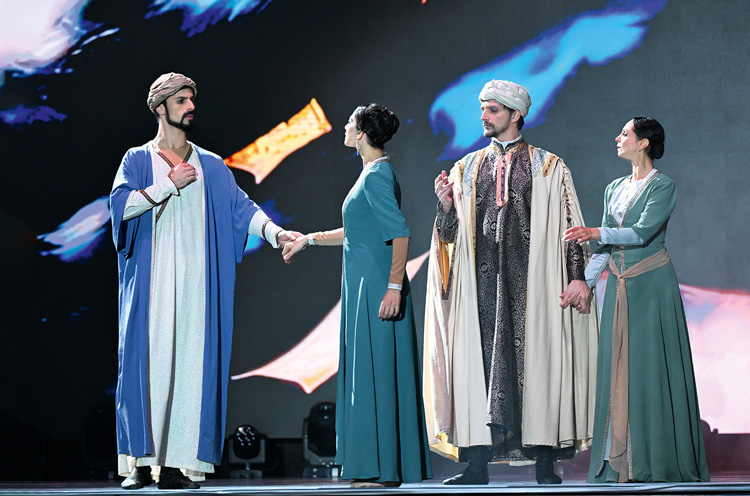 А.Л.: Событий в жизни Насими хватило бы на полномасштабный двухактный балет. Да, можно было рассказать в танце, как взрослеет маленький мальчик, как знакомится с Учителем, как этого Учителя лишается, как женится, как у него появляется дочь. Как путешествует по разным странам, несет знания людям. И показать трагический финал – когда его арестовывают и казнят. У Насими была яркая жизнь, но Фикрет Амиров написал только 20 минут музыки! Мы добавили еще шесть минут из другого сочинения Амирова, но спектакль все равно получался небольшой. И тогда я предложил: а давайте герой будет свидетелем выступлений сегодняшних артистов! Чтобы с самого начала, в котором запланированы концертные номера, Насими и его Учитель были на сцене, словно попали в будущее и видели, как стихи героя превратились в песни и танцы, сколь знаменитым стал Насими, как его любят в народе. И вот на сцене Ансамбль песни и танца имени Фикрета Амирова (они приехали с танцем «Суфи»), пели замечательные вокалисты Севда Алекперзаде и Чингиз Мустафаев, выступали Алим Гасымов и Натиг Ширинов с его ритм-группой «Натиг», а Насими и его Учитель слушали и смотрели. Когда вокальная часть завершилась, начался собственно балет. Но это тоже не буквальная биография поэта и философа. Понятно, что герой все равно погибал, но его казнь не стала финальной точкой спектакля – Насими не даром умирал, ему открывалась дорога к бессмертию. Ведь прошло более 600 лет, а его имя не только не забыто, но с каждым годом становится все более значимым.