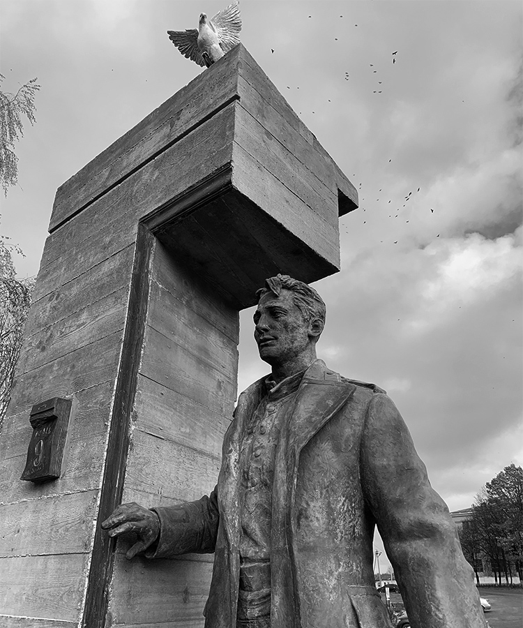 Осенью 2020 года на площади города Кашина в Тверской области был открыт памятник солдату, вернувшемуся с войны, – первая композиция Адиля Алиева, посвященная военной истории. Работа над монументом продолжалась больше полутора лет и была не самой простой не только в силу темы и не только потому, что у памятника есть реальный прототип – кашинский лейтенант Василий Волков. Фигуру солдата нужно было встроить в уже существующий скульптурно-архитектурный ансамбль площади, который включает памятник матери и ребенку, провожающим мужа и отца на войну, и барельефную стену с лицами воинов. Своей работой Адиль словно завершал триптих: тяжелое время закончилось надеждой на мирное будущее. Неслучайно в композиции вместе с солдатом, переступающим порог дома, появляется белый голубь.