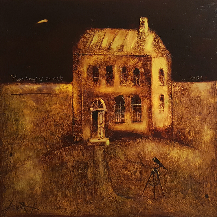 Эта картина из серии «Терраформирование» навеяна тем самым домом. Я часто рисую одинокие дома. Они олицетворяют безмолвие и мою любовь к одиночеству. Хотя в доме открыты двери – там моя семья. Телескоп напротив говорит о том, что это дом астронома. В ночном небе мы видим комету Галлея – самую древнюю комету, которую открыли еще до нашей эры. Она возвращается к Солнцу каждые 75 лет, и в следующий раз ее можно будет увидеть невооруженным глазом в 2061 году – я специально указал эту дату.