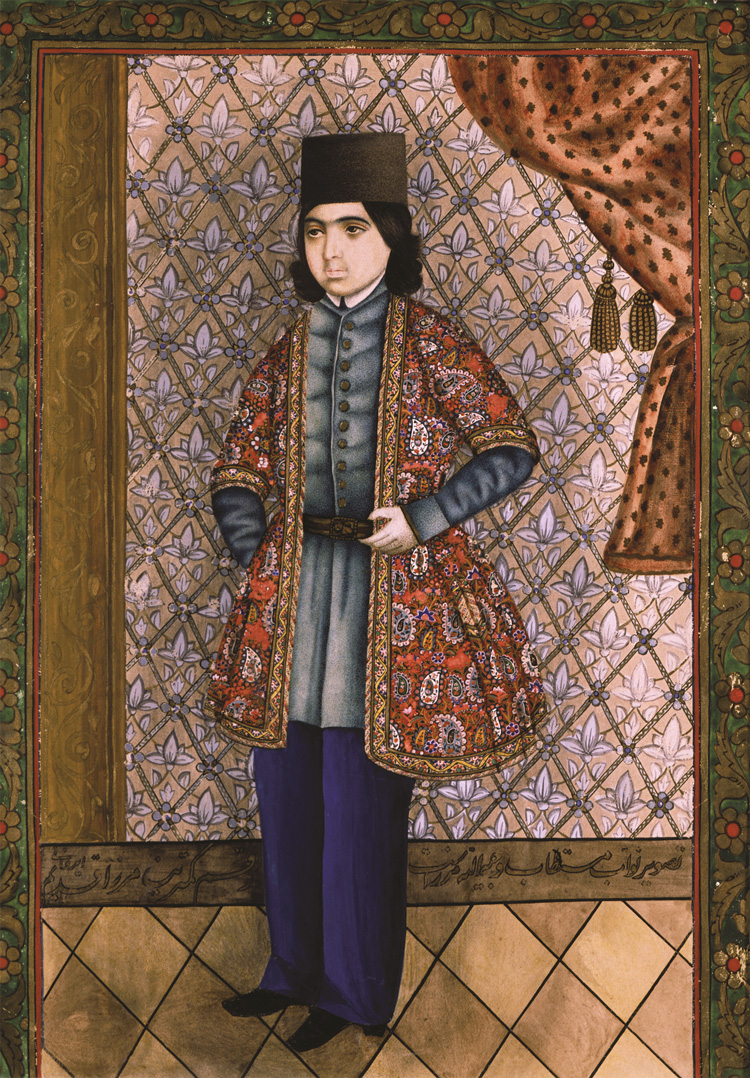 Образ юноши выполнен по канонам официального портрета. Костюм обычен для аристократа каджарской эпохи: брюки европейского образца и традиционный полукафтан-архалыг, украшенный орнаментом бута. Ткань тирме, из которой сшит архалыг, перекликается с пышным убранством интерьера.