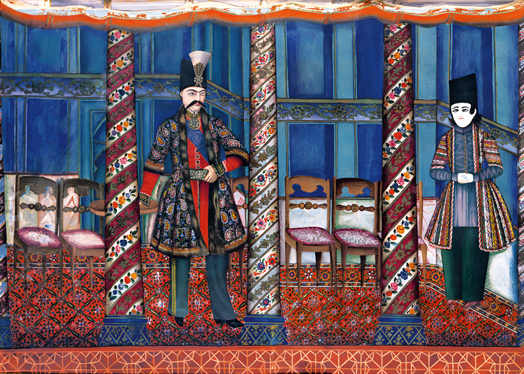 Иревани неоднократно обращался к образу Насреддин-шаха, четвертого из династии Каджаров, чье правление стало одним из самых долгих за весь исламский период истории Персии. Сценка, изображенная Мирзой Кадымом Иревани, скорее всего, происходит во дворце Гюлистан, построенном в XVI веке сефевидским шахом Тахмасибом I, а затем ставшем резиденцией Каджаров. Это позволяет предположить, что художник отталкивался от какой-то картины или гравюры. В центре изображен Насреддин-шах, опирающийся на круглый стол. Второй персонаж – скорее всего, юный придворный Мелиджек, любимец правителя.