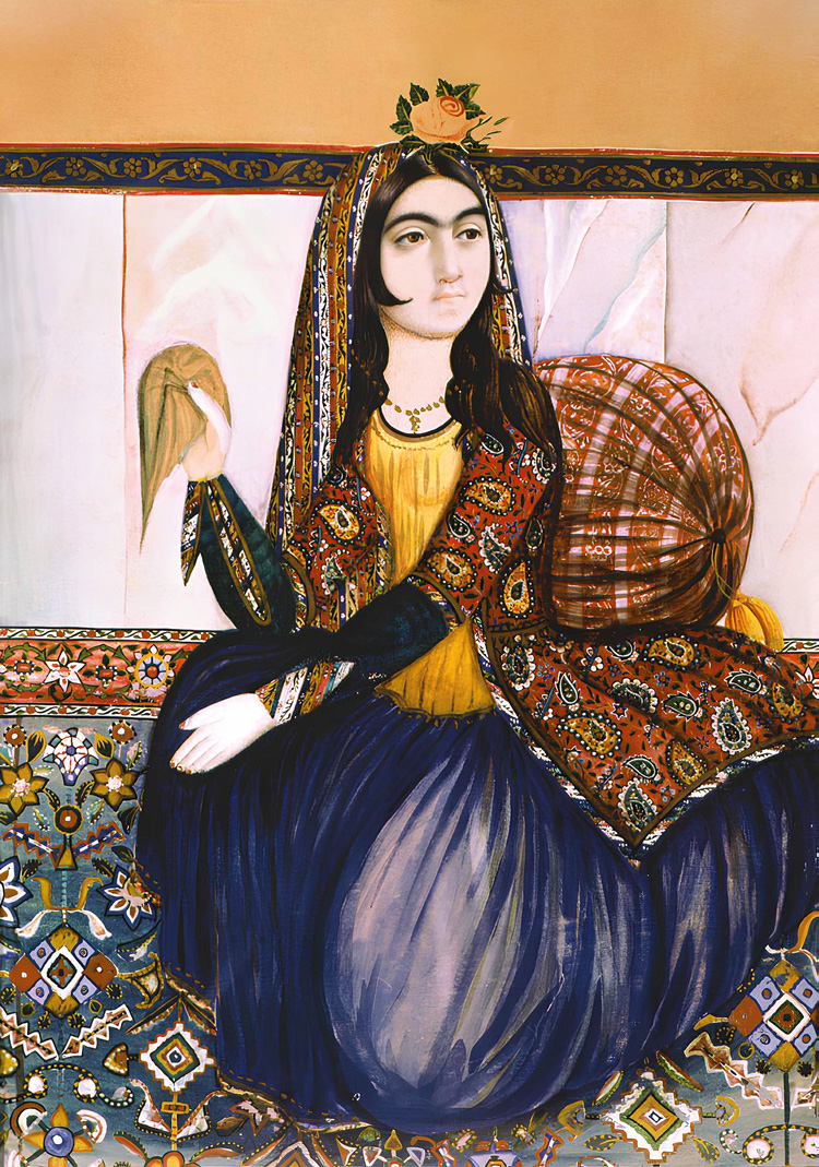 В складках юбки и цилиндрической подушки-мутаки за спиной незнакомки чувствуется объем, но этим реалистичность фигуры и ограничивается: верхняя одежда и рубашка переданы плоскостно, зато со всем тщанием выписан сложный орнамент пестрой ткани тирме, из которой сшита верхняя одежда, а также полосы узорчатого покрывала на голове женщины. Еще более сложный орнамент покрывает ковер, на котором сидит героиня. Характерно, что последний изображен в традиции миниатюр – не в перспективе, а строго вертикально.