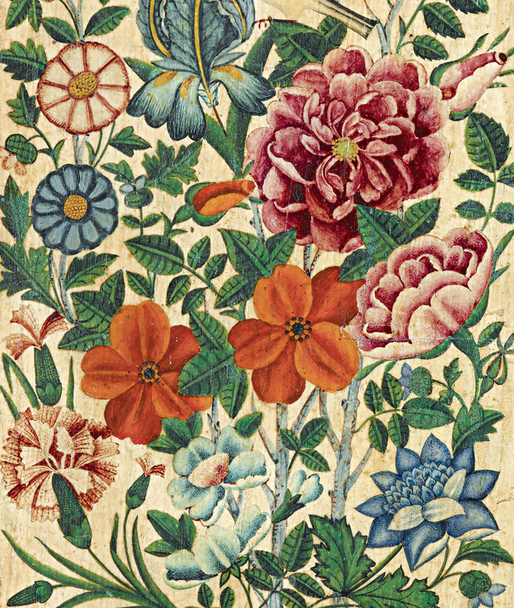 Сравнительно несложный орнамент занавеси, подхваченной шнуром с кистями, оттеняет ромбический узор на стене, который, в свою очередь, рифмуется с ромбическим рисунком на полу. Последний изображен в традициях миниатюры, без соблюдения перспективы. Еще больше картину роднит с миниатюрой характерный прием – вписанные в какую-либо деталь (в данном случае в панель плинтуса) имена портретируемого и мастера.