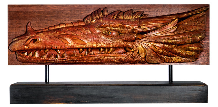 Я рассыпался в благодарностях. Мы с друзьями с трудом этот кусок вытащили, и он еще 30 лет пролежал у меня в мастерской. Потом, в 2017-м, мою супругу позвали работать в Таджикистан, и мы переехали. Я перевез все свои материалы и инструменты, включая это дерево. Там оно прожило с нами еще года два. В один прекрасный момент я начал лепить эскиз – голову дракона. Идея мне понравилась, я посмотрел на махагон и решил, что время пришло. И получилась такая работа – по-своему уникальная, потому что такого дракона нет ни в одной иконографии. Это не китайский дракон, к которым все привыкли. Это азербайджанский дракон, и, как заметила моя супруга, он улыбается. Надо сказать, что работать с махагоном было невероятно приятно – оказался действительно идеальный материал».