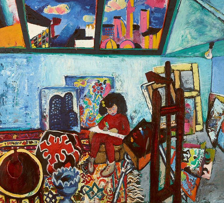 Изначально эта картина была совершенно другой: в ее центре папа изобразил себя стоящим у мольберта. Полотно получилось несколько статичным, зато были прекрасно видны колоритные детали: инкрустированная мебель, прекрасный ковер и арабские кожаные пуфы, которые отцу подарил президент Египта Гамаль Абдель Насер, передав посылку через посла СССР в Египте. Эти пуфы невероятно украшали мастерскую!