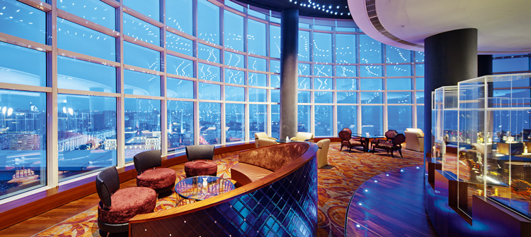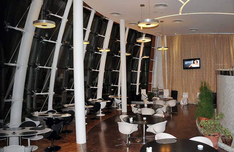 Вращающаяся терраса с панорамным видом на город на верхнем этаже отеля Hilton, открытого осенью 2011 года. Формат заведения – коктейль-бар; есть лаунж-зона, играют диджеи. Средний счет на человека – 35–45 манат.