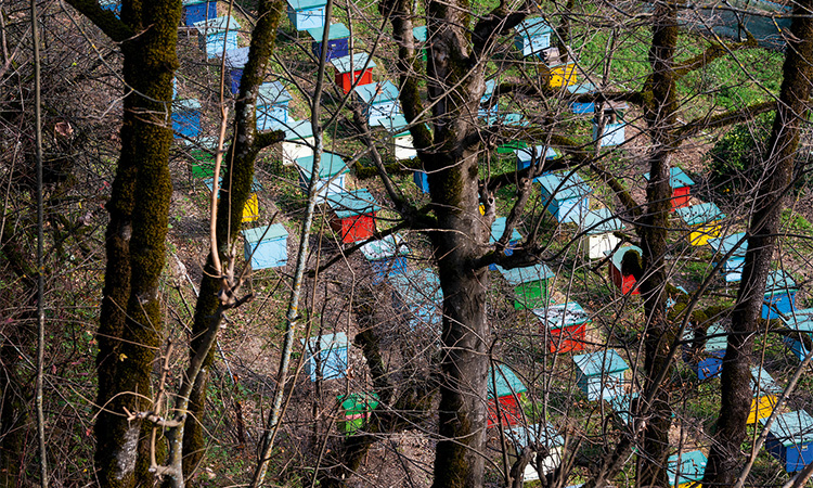 Обед заканчивается астаринским чаем (условно местным, мы видели его плантации по дороге) и местным медом. В Сыме стоят сотни голубых коробочек-ульев, пчелам есть где развернуться. Поздней весной, когда деревья на склонах гор и в садах зацветают, долина преображается до неузнаваемости.