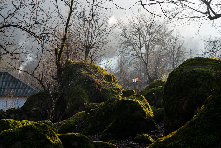 Сегодня здесь стоит величественный осенний сумрак. Мы спускаемся в село, и первое, что поражает, – огромные валуны. Очевидно, они появились здесь задолго до людей. Именно эти древние камни определяют инфраструктуру села – между ними проложены дороги и устроены хозяйства (кстати, здесь нет глухих заборов, только деревянные плетни). Валуны поросли мхом и лишайником, какими-то микроскопическими цветами и суккулентами – вот где настоящий микромир, если присмотреться! Те же мягкие пружинистые мхи покрывают дорогу, создавая эффект живого изумрудного ковра. Из-за валуна привлеченный звуками наших голосов выглядывает любопытный молодой бычок – вся живность в Сыме ходит где хочет.