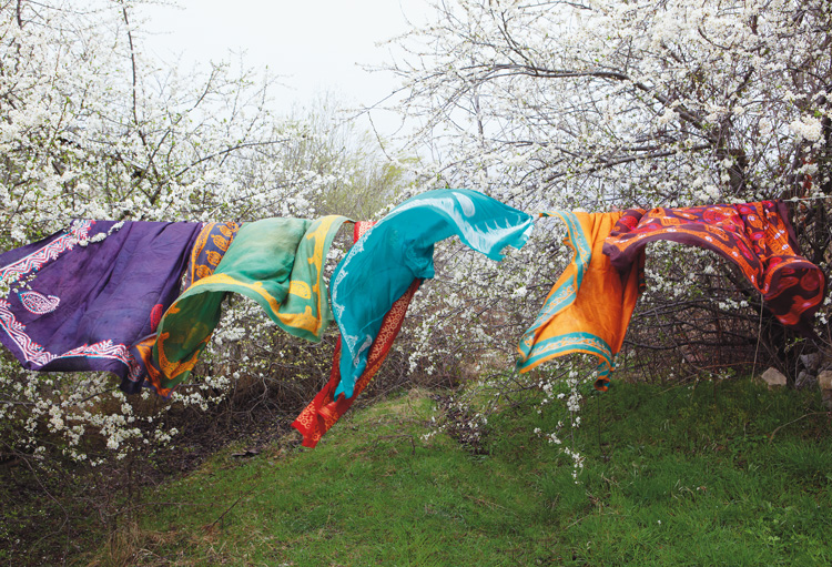 Мастерская платков в Баскале работает круглый год, но самая активная пора здесь – весна, лето и начало осени. В апреле в Баскале начинают цвести вишни, и на веревках, натянутых между цветущими деревьями, мастера развешивают для просушки только что окрашенные шелковые платки.