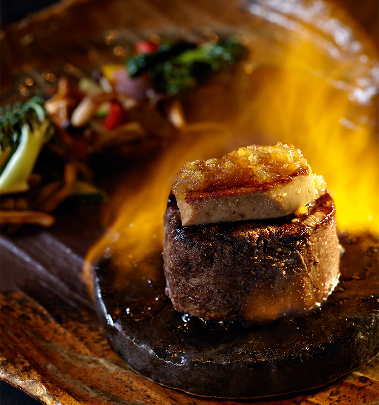Говядину обжарьте на гриле до состояния medium rare; одновременно обжарьте на сковороде фуа-гра так, чтобы она приобрела текстуру пудинга (важно, чтобы сковорода не была слишком горячей). Приготовьте чатни из японского цитруса юзу: цукаты протомите с уксусом и яблочным соком до консистенции загустевшего варенья. Если под рукой нет цукатов юзу, Бенджамин советует приготовить любое фруктовое кисло-сладкое чатни. Блюдо сервируйте на горячем камне: на стейк выложите фуа-гра, на него – ложечку чатни, все вместе полейте коньяком и подожгите. Подайте вместе с соте из овощей и грибов.