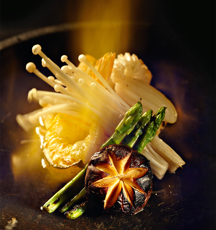 На очень горячей сковороде, слегка смазанной топленым маслом, обжарьте рыбу и морепродукты с одной стороны. Запеките на гриле шляпку шиитаке. Разогрейте на огне огнеупорный керамический сотейник, смажьте топленым маслом, выложите в него рыбу и морепродукты сырой стороной, добавьте иноки, мини-спаржу и шиитаке. Все полейте саке и смесью сока юзу и соевого соуса, подожгите. Затем накройте керамической крышкой, чтобы под ней блюдо дошло до готовности в собственном пару. Подавайте через 5–10 минут, сняв крышку непосредственно перед гостями.