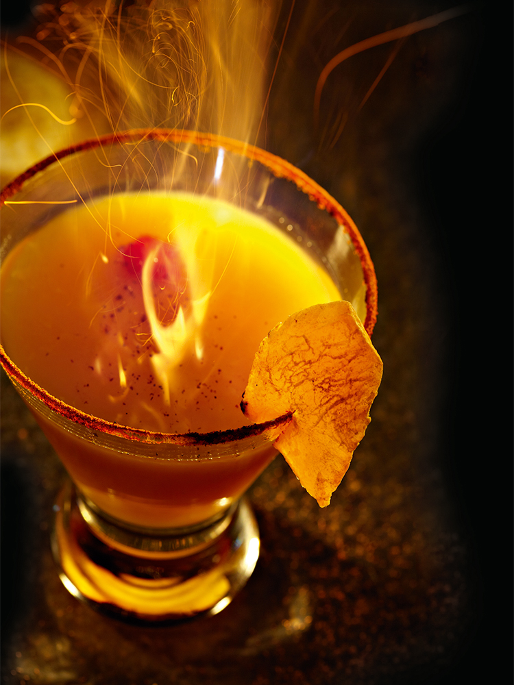 Смешайте в шейкере водку и фруктовые пюре. Края бокала обмакните сначала в сахарный сироп, потом в перечный порошок, чтобы образовалась красивая каемка. Перелейте коктейль в бокал, добавьте ром и корицу и подожгите. Фейерверк в бокале будет продолжаться целую минуту!