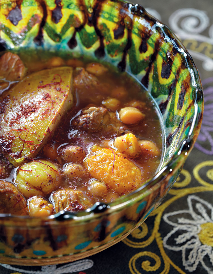 Нут для пити замачивают на 8–12 часов. Если нут пролежит в воде недолго, он не успеет набухнуть и, даже сваренный, будет жестковат. Положите в горшочек нут и мясо. Залейте водой. Поставьте горшочек на сильный огонь. Когда появится пена, снимите ее, помешайте содержимое горшочка, чтобы оставшаяся пена тоже всплыла, и опять снимите. Положите в горшочек курдюк и варите, пока не всплывет пена, образовавшаяся от курдюка. Снимите ее.Все остальные ингредиенты добавляются в горшочек таким образом, чтобы курдюк неизменно оказывался сверху. Следующий на очереди лук. После того как вы всыпали в горшочек столовую ложку мелко порезанного лука, подождите несколько минут и опять снимите пену. Теперь, добавив в горшочек немного соли – на кончике чайной ложки, пора закрыть его крышкой и поставить в духовку. Пити в духовке должен не вариться, а томиться, поэтому огонь делают небольшим. После того как горшочек 40 минут простоял в духовке, в него нужно добавить дольку айвы. Сделайте это, не вынимая пити из духовки. Через 20–25 минут положите туда же сливу и влейте чайную ложку заваренного шафрана. Оставьте еще на полчаса. Теперь пришел черед каштанов. Их нужно предварительно сварить и очистить. Делается это так: каштаны надрезают и бросают в кипяток на две-три минуты. Потом, еще горячими, очищают (холодные каштаны очистить от кожуры практически невозможно). После добавления каштанов в горшочек (тоже под курдюк) блюдо должно постоять в духовке еще 20 минут. Если вы хотите, чтобы курдюк был с корочкой, снимите с горшочка крышку. Блюдо готово.