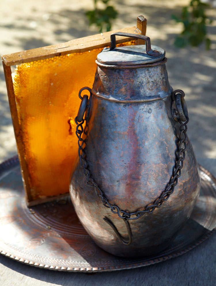 Богатые медоносные угодья и климат Азербайджана нравятся пчелам, и мед здесь получается отличный. Местное пчеловодство интересно разнообразием ульев: колода-стояк – «гюд», сапетка – «себет», колода-лежак – «тякня»… Изготавливали их из дерева, веток, глины и соломы, а c XIX века началась пора рамочных ульев. Душистый мед собирали и хранили в разнообразных глиняных, деревянных и металлических сосудах – таких как этот, из коллекции Музея античной посуды в поселке Гала.